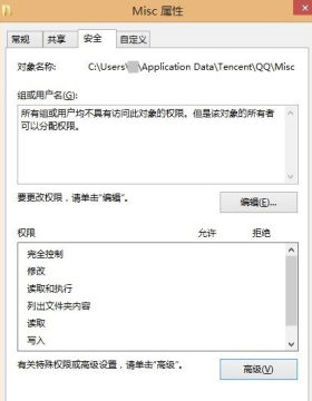 退回到上一层文件夹,然后右击文件夹 Misc ,选择 属性:点击 安全选项卡,然后点击下方的 高级 :