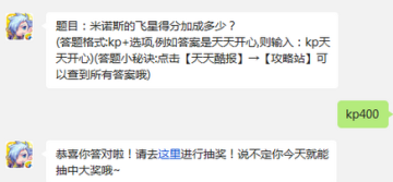 米诺斯的飞星得分加成400喔,所以9月3日的天天酷跑每日一题答案就是kp400,最后希望所有的小伙伴都能领取每日一题的奖励。