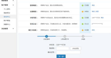 先输入你的姓名和身份证号码进行实名认证;然后设置银行卡信息。