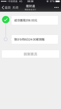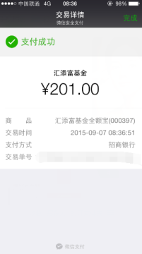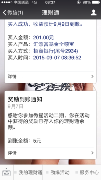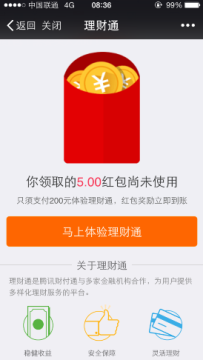 3、买入201元基金后,5元理财通红包就到账啦!然后直接将206元提现就可以啦!