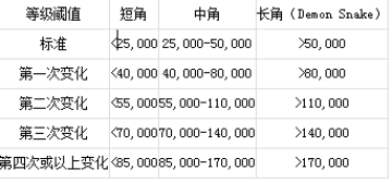 标准:短角,恶魔值小于25000,中角,恶魔值在25000和50000之间,长角(Demon Snake),恶魔值大于50000
