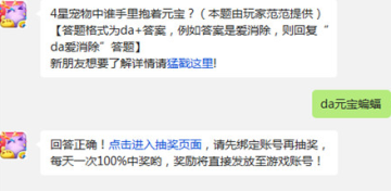 作者:qqtn小影 人气:0天天爱消除4星宠物中谁手里抱着元宝?9月10日每日一题活动已经更新,今天的题目就是考验玩家们玩游戏的时候细不细心了,下面就和小编一起来看看天天爱消除9月10日每日一题的答案吧。
