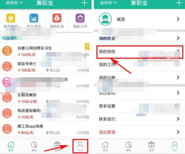 1)打开兼职宝,点击右下角的【个人】,然后点击【我的钱包】;(如下图)