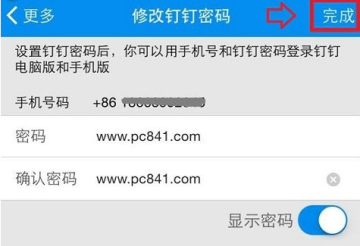 三、接下来就进入了钉钉密码修改界面,在密码和确认密码栏输入新密码即可,完成后点击右上角的【完成】,如下图所示。