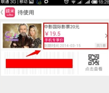 3、进入待使用的,我购买了一张电影票,点击此电影票。