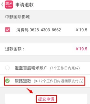 5、选择退款方式,可以退致百度糥米账户也可以原路退款,看自己的意愿。退至百度糥米账户需要七天工作日内就可以完成,原路退款需要的时候长一点大概需要9-12个工作日方能完成。最后点击【提交申请】