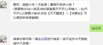 超能少年(无炫装)最高升到120喔,所以9月17日的天天酷跑每日一题答案就是kp120,最后希望所有的小伙伴都能领取每日一题的奖励。
