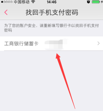 6、进入到“找回手机支付密码”可以看到绑定的银行卡,点击该银行卡