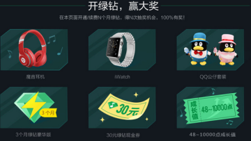 3、本活动页面开通1个月即送1次抽奖机会,开通1年送12次抽奖机会,以此类推。获得抽奖机会的用户有机会获得魔音头戴式耳机、iWatch、QQ公仔套装、3个月绿钻豪华版、30元绿钻现金券、48~10000点成长值,100%中奖,幸运随时降临噢!