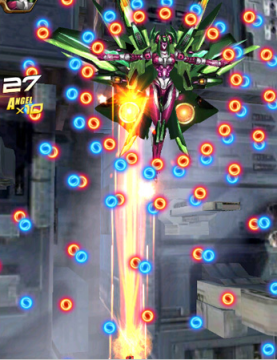 首先是圈型弹幕,这种弹幕第6关的时候尼姬也有,但是相比第6关,第17关的圈型弹幕的圈数变的更多了,而且会交替发射,弹幕密集程度比第6关的时候高,不过躲法都是一样的,只要操控机甲进行微操就可以躲过。
