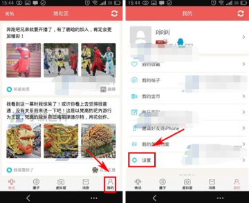 1)打开她社区进入应用后点击导航栏【我的】,接着点击【设置】功能。(如下图)