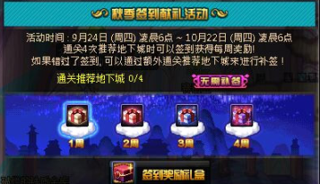 活动期间,每个帐号每周可获得一次签到机会,一周中有一天通关4次推荐地下城后点击活动窗口的【签到】按钮即可获得每周的签到奖励!