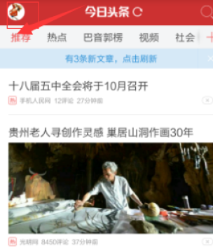 3、然后在我们登陆到今日头条后,我们在它的主界面左侧顶部找到我们的头像图标,然后点击一下。