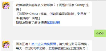 作者:qqtn小影 人气:0天天爱消除收件箱最多能存多少封邮件?10月2日每日一题活动已经更新,今天的题目就是考验玩家们玩游戏的时候细不细心了,下面就和小编一起来看看天天爱消除10月2日每日一题的答案吧。
