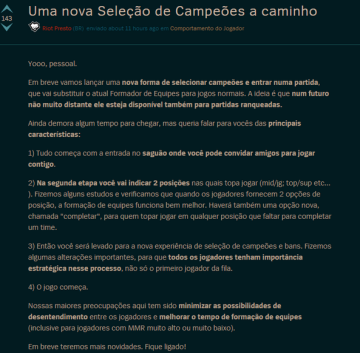 Riot Presto在巴西官方论坛上发帖表示,很快游戏将使用全新的英雄选择和加入游戏方式: