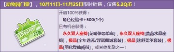 金秋十月,动物园门票来袭!10月11日-11月25日,仅需5.2Q币,开启必得角色经验卡+500,还有机会获赠永久双人座椅【花晴依恋单车/蔷薇水晶座椅】、极品【宇年逸苏/浮诺倾城套装】、【迷舒莞尔套装】、极品配饰【羽化登仙戒指】或其他奖励之一!