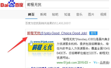 在百度上搜索“前程无忧”,然后在搜索结果中点击进入前程无忧官网。(如下图)