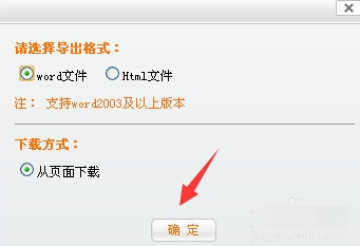 接着会弹出啦一个相应的窗口,可以在里面选择相应的导出格式,比如:word格式的,直接选择从页面下载,再点击“确定”按钮。(如下图)