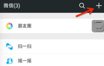 在手机中打开您的微信客户端,然后点击微信主界面右上角的“+”按钮,如图所示。