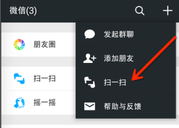 在出现的菜单选项列表中,您会看到四个选项,点击其中的“扫一扫”选项打开扫描二维码界面,如图所示。