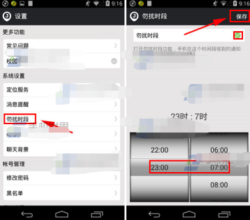 2)找到并点击【勿扰时段】。进入勿扰时段后,首先开启【勿扰时段】然后设置勿扰时间,最后点击右上角的【保存】。(如下图)