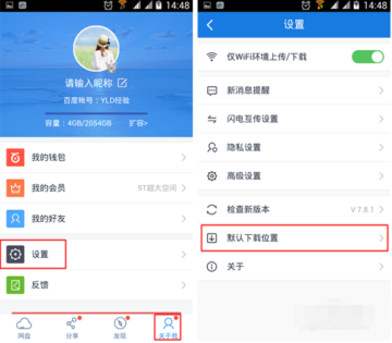如果要改默认保存位置,可以按照如下方法进行操作,在关于我的页面,先点击进入“设置”然后选择“默认下载位置”
