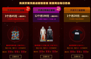活动期间,用户在页面开通好莱坞星战套餐,开通完成后即可在指定时间参与相应周边秒杀,每个套餐限成功秒杀1次。