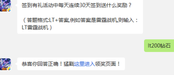 签到有礼活动中每天连续30天签到送200钻石喔,所以10月17日雷霆战机每日一题答案就是lt200钻石,最后pc6小编希望所有的小伙伴都能领取每日一题的奖励。