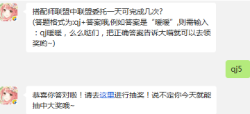 (答题格式为:qj+答案哦,例如答案是“暖暖”,则需输入:qj暖暖,么么哒们,把正确答案告诉大喵就可以去领奖哟~)