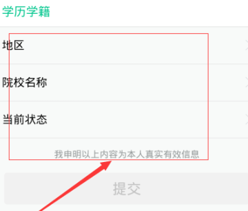 点击打开学历学籍之后,看到下面有关于地区,学校名称,当前状态等等的选项,我们按照要求全部填写完成,填写完成之后下面有一个提交选项,我们点击提交,即可成功设置。