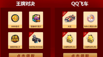 同时在《王牌对决》和《QQ飞车》里创建角色的玩家,即可获得以下活动礼品,每个QQ限领一次,数量有限,领完即止。