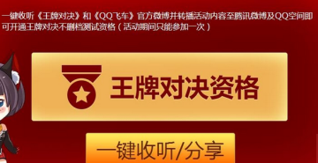 一键收听《王牌对决》和《QQ飞车》官方微博并转播活动内容至腾讯微博及QQ空间即 可开通王牌对决不删档测试资格(活动期间只能参加一次)