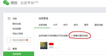 第四、如果“隐藏关键词消息”你默认勾上,选择了此项,那么你的活动回复消息是完全看不到的。看到的是与关键词无关的用户留言。此时要取消“隐藏关键词消息”,去掉前面的勾号。如下图所示: