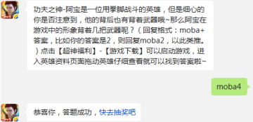 作者:qqtn小影 人气:0全民超神功夫之神-阿宝是一位用拳脚战斗的英雄,但是细心的你是否注意到,他的背后也有背着武器哦,那么全民超神功夫之神阿宝在游戏中的形象背着几把武器?10月25日微信每日一题活动已经更新,今天的题目就是考验玩家们玩游戏的时候细不细心了,下面就和小编一起来看看全民超神10月25日每日一题的答案吧。