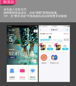 做任务主要是下载体验手机App和手机游戏,非常简单。在任务大厅里的“体验任务”区有很多待完成的精彩人物,按照要求完成下载任务和签到任务即可获得经验值。