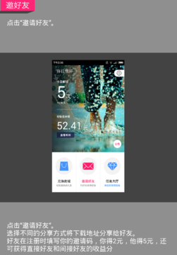 在App主界面点击邀请好友,可以选择不同分享方式将下载地址分享给好友。好友注册时填写你的邀请码,你就能得到2元,好友得5元,还可以获得直接好友和间接好友的收益分成。