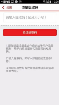 活动期间关注微信公众号“天翼阅读”,并回复“我要流量”下载“流量宝”APP,并注册登录,登陆后点击“兑换-流量码提取”输入你的专属流量兑换码,验证提取码,最后点击首页“流量券”即可领取了。