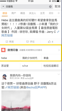 开启新浪微博印象有两种方法,小编以田馥甄为例子。第一种方法,打开手机微博,在微博搜索里输入她的名字,然后在搜索框下面选择印象,点击开启微博印象即可。