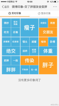 从下图可以看出,关于胖的关键词里分为实时印象和整体印象,当是微博网友所讨论的哦!