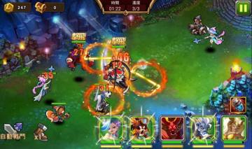 在主要玩法上,本作分为一般战斗以及塔防两种游戏模式。一般战斗借用了MOBA 游戏的部分规则,玩家可以派出五名英雄角色进行关卡。一个关卡分成三场战斗,每打完一场就会往前「推进」至下一场战斗的位置,呈现出MOBA 游戏中「从我家打到对方家」的感觉。