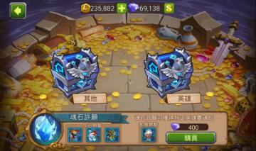强化角色所需的符文、装备、以及灵魂石都可以在主线或是水晶地牢等特殊关卡中获得,而升级技能所需的点数则会随时间慢慢增加。但如果刷关卡刷不到想要的道具,就到许愿池去碰碰运气吧!许愿池分为金币、钻石、以及魂石许愿三种,其中金币就是花费游戏币抽取的转蛋,每天都有五次免费的机会,可能得到英雄、装备、灵魂石或其他杂物。而花费钻石当然能够抽到星等较高的英雄或道具,但如果有特别想要的英雄,则可以考虑每天都提供不同英雄的魂石许愿。