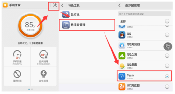 华为P7:打开自带的手机管家,右上角工具箱-悬浮窗管理-允许tesly应用