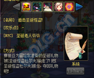 赛利亚为冒险家准备的圣诞礼物被圣诞怪盗杜尔夫偷走了!把圣诞怪盗杜尔夫抓住,夺回圣诞礼物吧。
