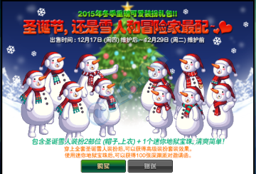 萌萌哒圣诞雪人装扮礼包上架,只能用点卷购买,时装为高级时装(只有帽子&上衣),覆盖其他时装,赠送地狱宝珠(100张深渊派对邀请函)