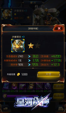 除了品质,机甲的星级也是提高机甲能力的必选之一。大家通过进行寻宝、商城购买、通关指定关卡,来获取升级沙暴领主的机甲零件,对沙暴领主进行星级提升。沙暴领主的星级提升,可以有效的提高其生命力、攻击加成和同步率,让沙暴领主的能力更加高强。