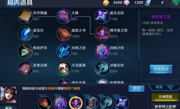 博学者之怒是我们俗称的帽子,也是游戏后期AP加成最高的一件装备;折磨面具所附带的灼伤效果和法穿效果非常不错,最主要的是给脆弱的貂蝉妹子一些可观的生命值加成,让她不容易被对面突进英雄一套带走。