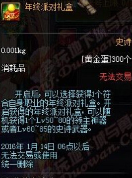也是每个帐号只能换一次哦。大家要想好换个哪个角色。开启后,玩家们可以选择获得1个符合自身职业的年终派对礼盒,开启可以随机获得1个50-80的领主神器或者60-85的史诗武器!