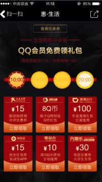 进入活动地址扫码后,即可看到QQ会员生活特权分会场,QQ会员整点免费领礼包入口。在这里我们可以看到,每个整点领取的礼包均不一样,整八点可以领理财通8Q币红包和大众点评优惠券哦!如果一次性开通超级会员三个月的用户,可以全部领取以下礼包: