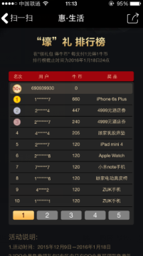 当你成功领取礼包后,每支付1元即可获得1牛币。获得牛币最多的前50名用户即可获得相对应的奖励。比如iPhone6s plus、酒店券、iPad mini4等。