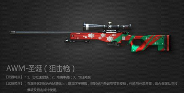 在属性优异的AWM基础上,增加了子弹数,同时使用圣诞节的节日皮肤,性能与外观并重,适合在团队竞技,爆破及狙击战中使用。
